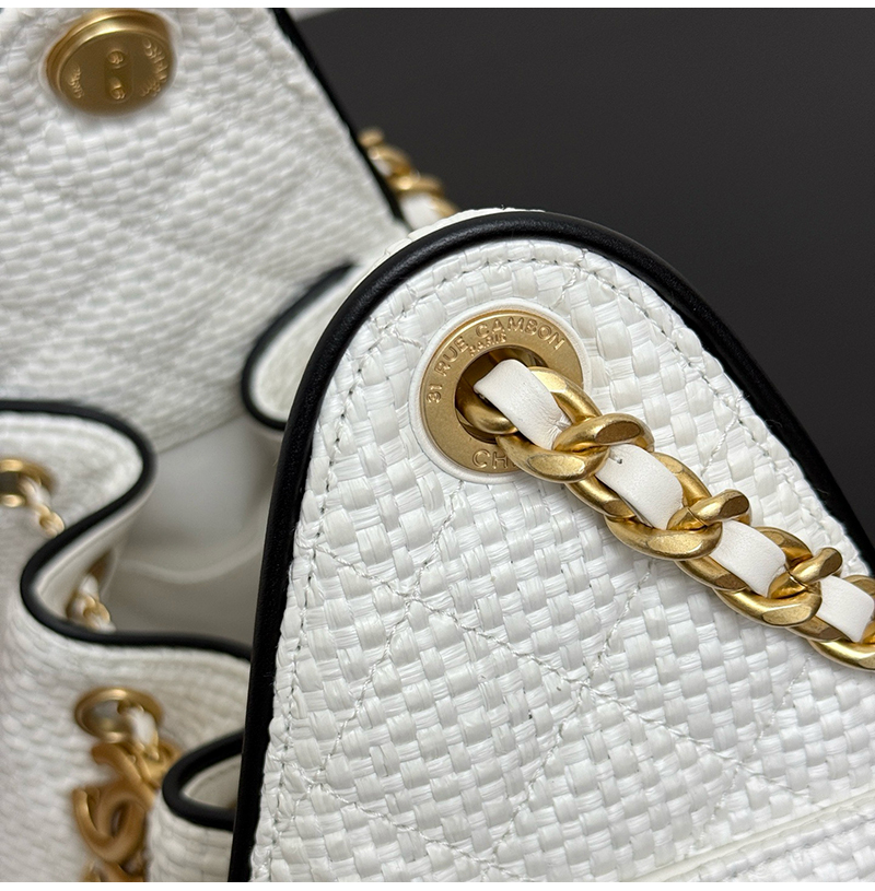 클래식한 버킷백 디자인, 퀼팅 패턴 ,드로우스트링, 더블 C 메탈 자물쇠가 돋보이는 감각적인 디자인! 베이지 컬러 브레 이드 소재는 가볍고 내구성이 좋으며, 블랙 포인트가 고급스 러움을 더해 데일리룩이나 캐주얼 자리 모두 잘 어울려요. 스몰 사이즈지만 수납력이 좋아 핸드폰, 화장품 등이 쏙 들어가고, 숄더 & 크로스 가능해 실용적이면서도 스타일리시! 최근 트렌디한 아이템으로 심플하고 우아한 스타일이 패션계 에서도 인기가 높아 다양한 코디에 쉽게 매치할 수 있어 눈길을 사로잡는 필수템입니다. 구매 만족도1위, 재구매율1위, 홍콩명품by럭셔리즘