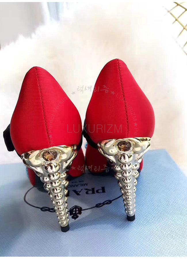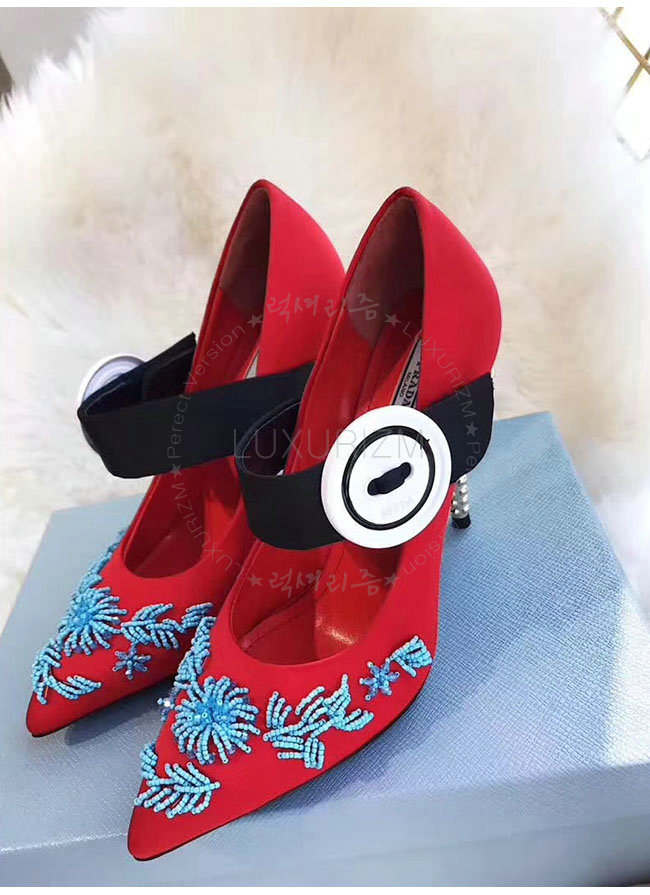 PRADA-1I011I 레드 실크 자수 메리 제인 펌프스 여성용