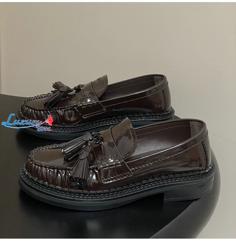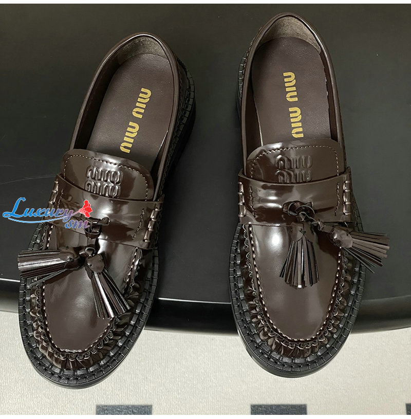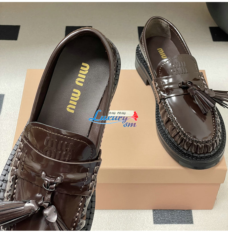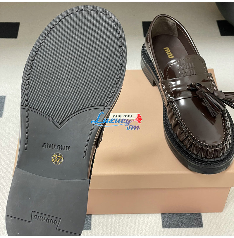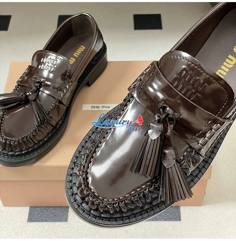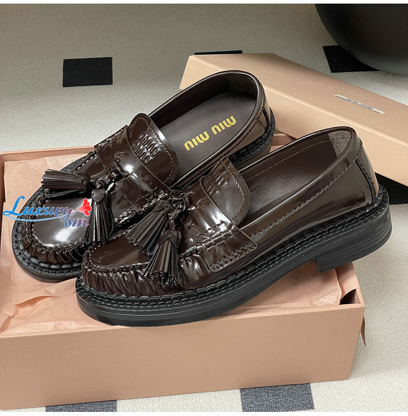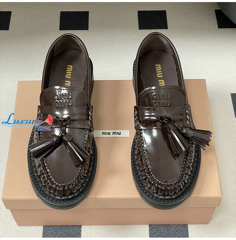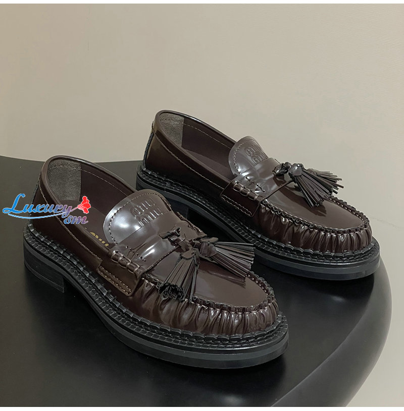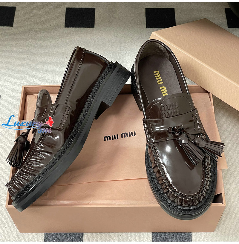 MIUMIU-5D497E 미우미우 브라운 폴리시드 가죽 테슬 로퍼