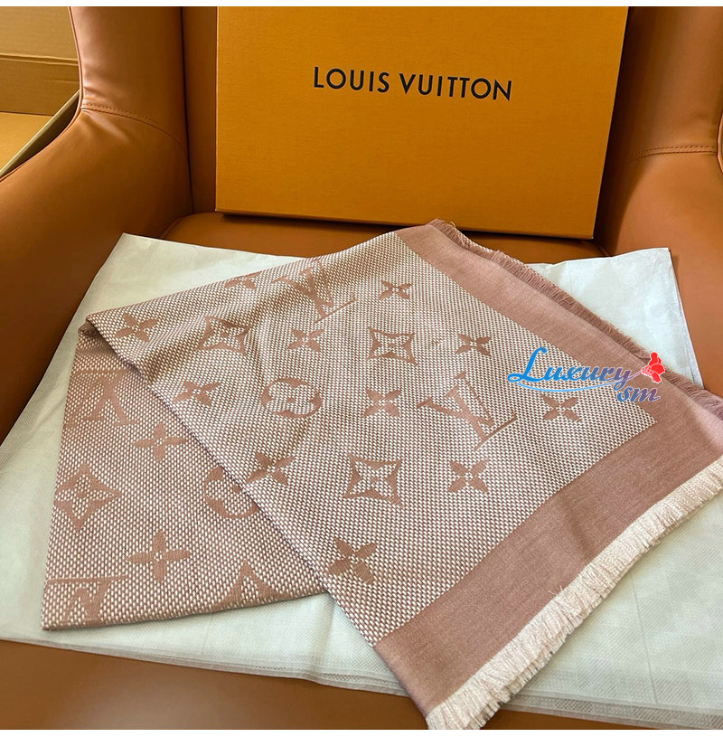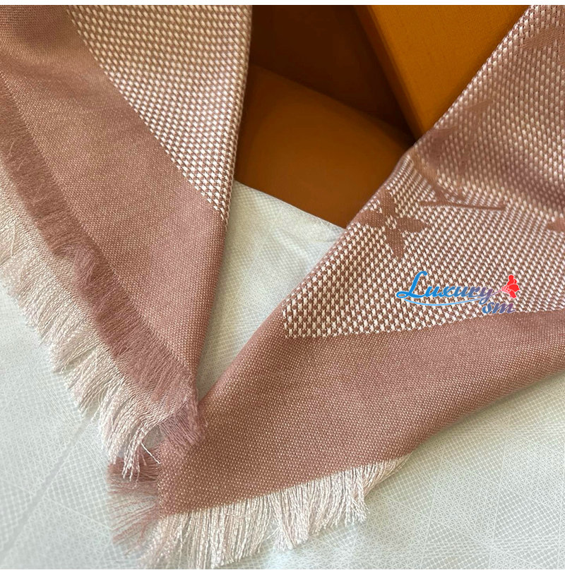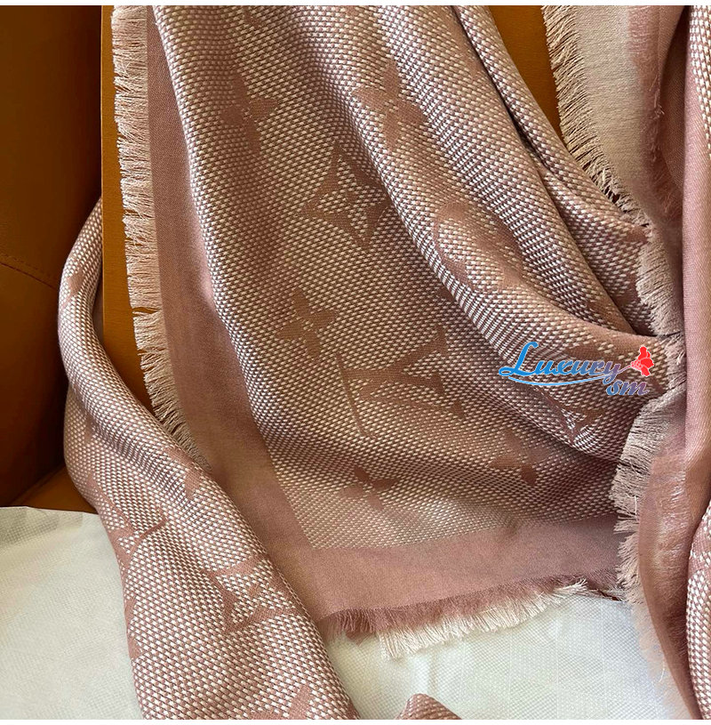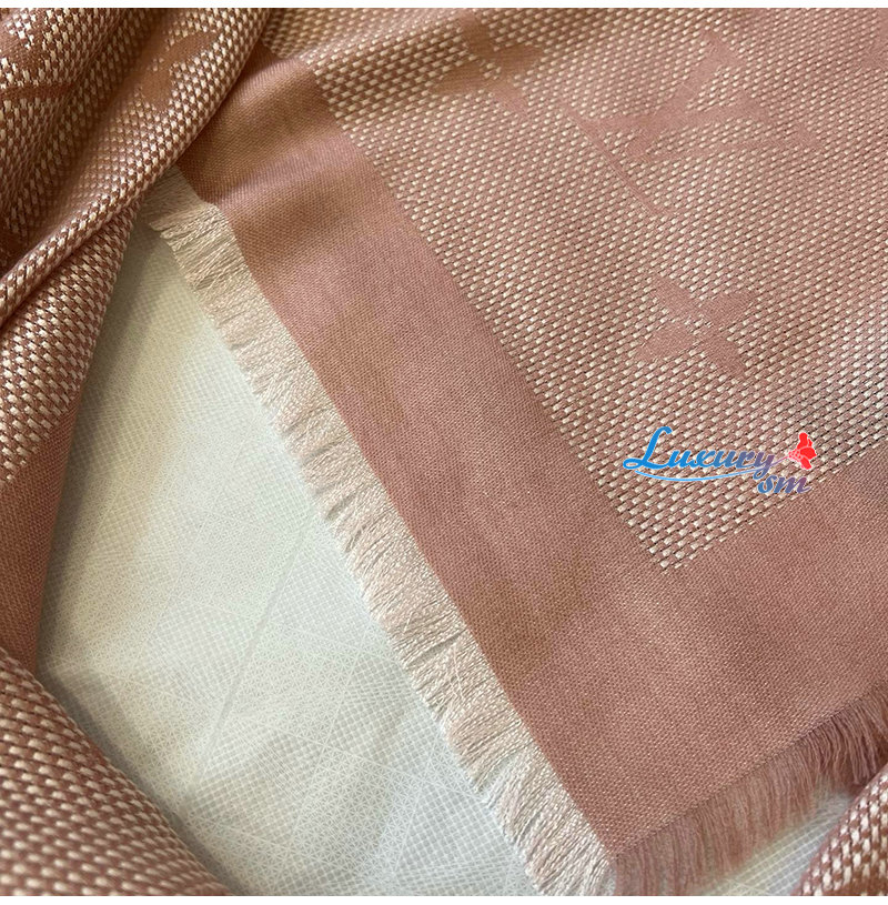 모노그램 숄. 나테 패브릭에 대비를 이루는 대형 모노