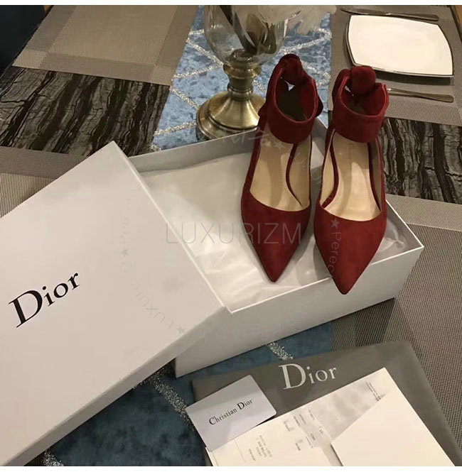 DIOR-KCB406 디올 레드 스웨이드 양가죽 리본 발레 펌프스 여성용